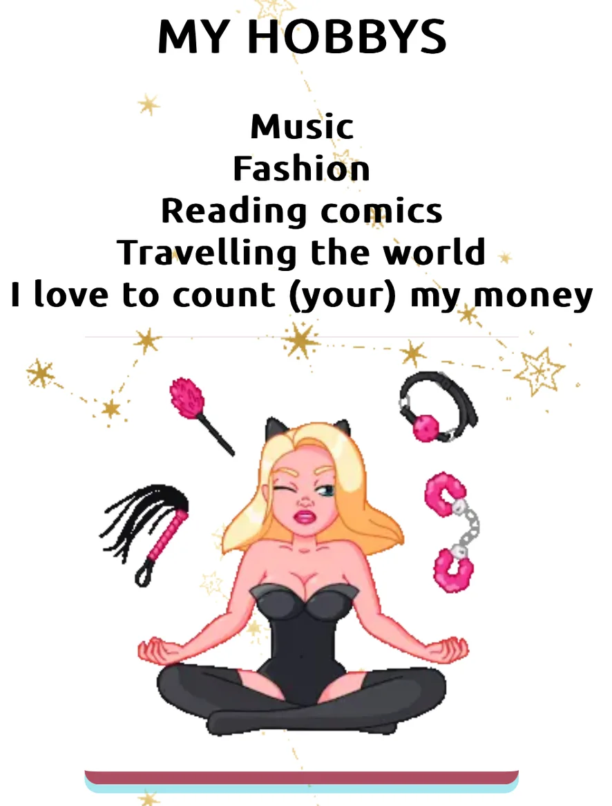 Ahegao, Felácio, Pata de Camelo, Cowgirl, Canzana, Dança Erótica, Fetiche por Pés, Tacões, Topless, Saia acima, Humilhação, Show de óleo, Striptease, Cosplay, Garganta funda, Dildo ou Vibrador, Conversa porca, Masturbação, Role Play, Banho, Ménage à trois, Squirt, Buraco da glória, Dominadora, Punheta, Dupla Penetração, Pegging, Corno